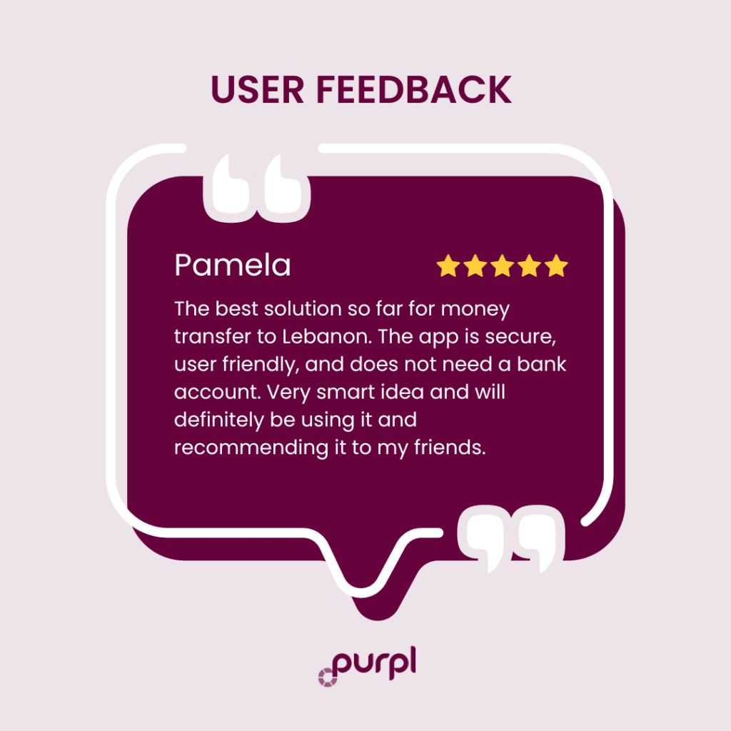 Purpl offers a reliable and efficient way to receive money in Lebanon. With low fees, lightning-fast transactions, and a commitment to innovation, Purpl is now the go-to app for money transfers to Lebanon, and soon, payments. Download Purpl today and experience financial convenience and ease of mind!