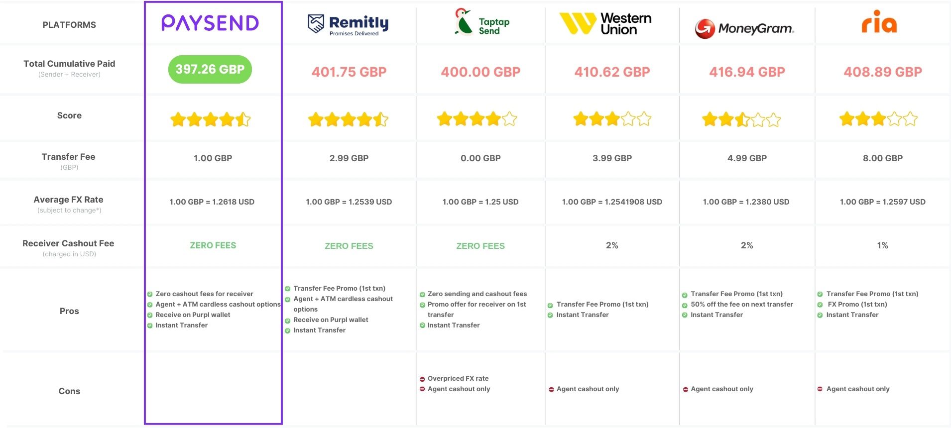 - Paysend offers the lowest total cost at 397.26 GBP with a minimal transfer fee of 1.00 GBP and zero cashout fees, making it the most cost-effective option.
