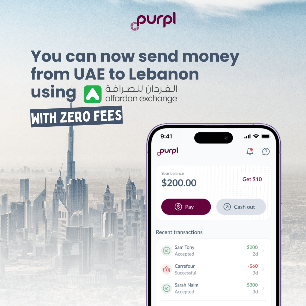 Together, Purpl and Al Fardan Exchange, stand with the Lebanese people in the UAE and in Lebanon. If you’re receiving money transfers from the UAE 🇦🇪, let your sender know they can use our partner, Al Fardan Exchange, to send money transfers with zero fees. Offer valid until: January 5th.